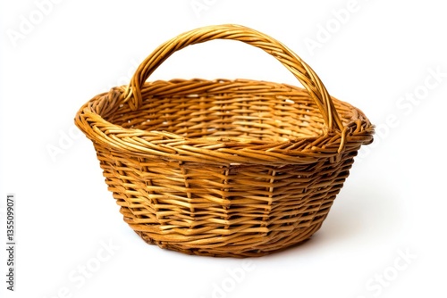 Empty Wicker Basket with Handle Isolated on White Background Studio Shot