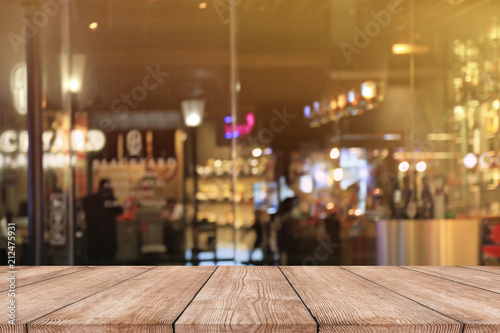 Empty wood table top with blurred light bokeh in night cafe restaurant background