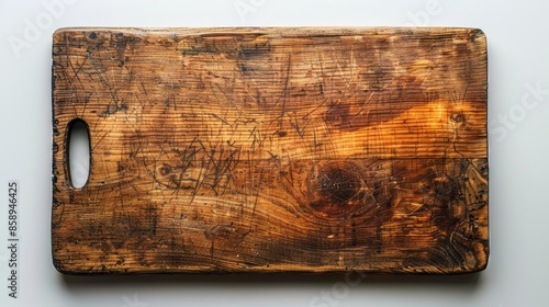 Empty wooden cutting board with natural wood texture, captured from above on a clean white background, perfect for food and recipe visuals