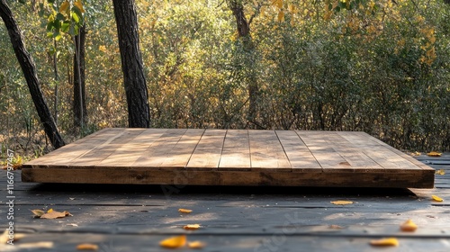 Empty Wooden Platform Surrounded by Nature in Autumn Forest Setting with Fallen Leaves and Sunlight Filtering Through Trees
