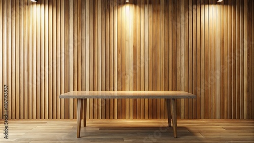 Empty wooden table against slatted wall background, ideal for product display or presentation