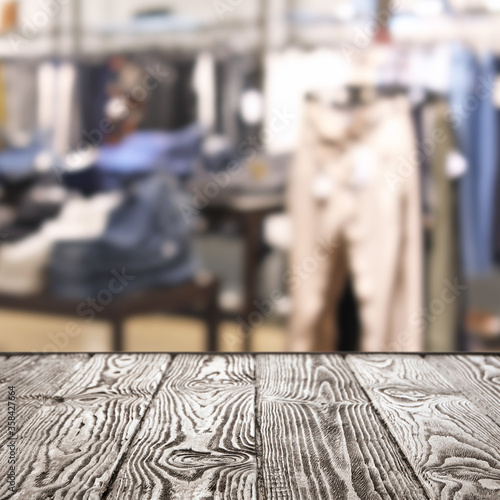 Empty wooden table and blurred view of store with modern clothes