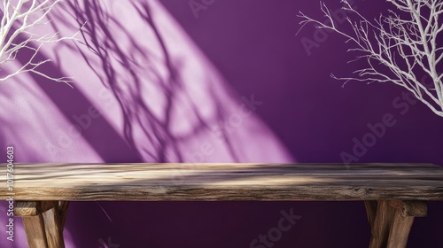 Empty wooden table over purple wall background with white branches for Halloween themed design and product display