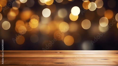 Empty wooden table top on blur light golden bokeh of cafe restaurant background. useful for product display montage.