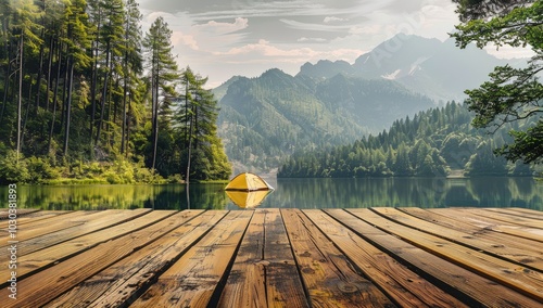 Empty wooden table top with a background of a camping tent and lake in a forest mountain landscape, for product display montage