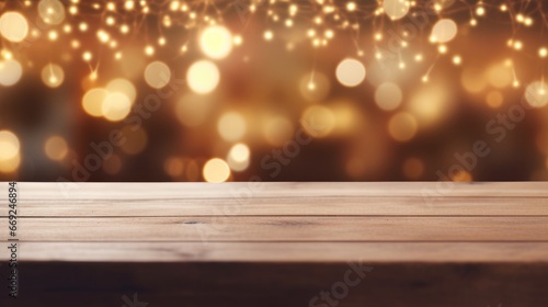 Empty wooden table top with defocused bokeh Christmas Fair lights background. Template for product display