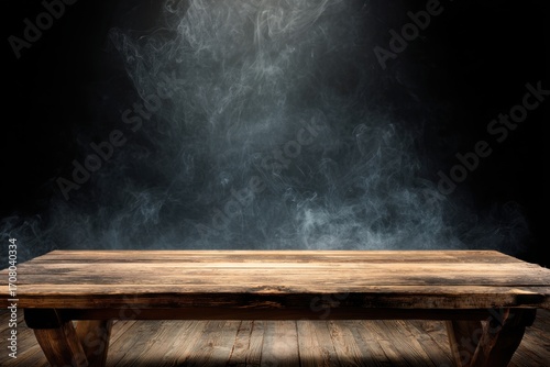 empty wooden table with smoke float up on dark background. MZ