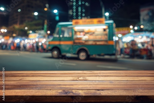 Empty wooden tabletop in front of a blurred street scene at night, featuring a food truck