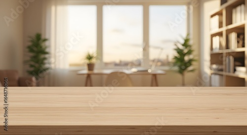 Empty Wooden Tabletop with Blurred Home Office Background and Window View.