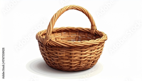 “Empty woven wicker basket with single arching handle, natural brown color and tight weave, isolated on white background”