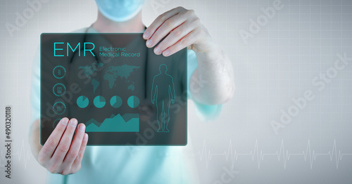 EMR (Electronic Medical Record). Doctor holding virtual letter with text and an interface. Medicine in the future