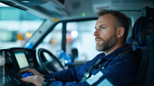 EMS drivers in their trucks, driving through city streets while remaining alert and focused. The drivers are dressed in their uniforms, equipped with communication devices, and rea
