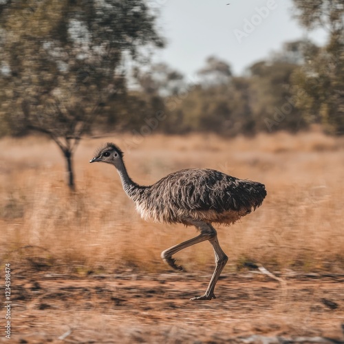Emu Walking Gracefully Through a Sunlit Australian Landscape with Green Trees in Background