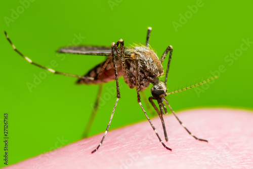Encephalitis, Yellow Fever, Malaria Disease or Zika Virus Infected Culex Mosquito Parasite Insect Macro on Green Background