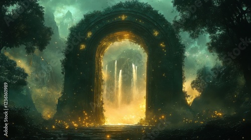 Enchanted Ancient Gateway Illuminated by Mystical Light in a Magical Forest