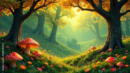 Enchanted Autumn Forest Scene with Vibrant Mushrooms and Blooming Flowers Under Golden Sunlight