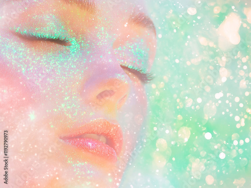 Enchanted Beauty: A close-up portrait of a woman's face adorned with shimmering, iridescent makeup, evoking a sense of ethereal fantasy and captivating allure. The soft.