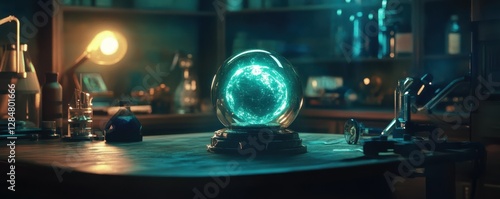 Enchanted crystal ball in mysterious laboratory with vintage scientific equipment and dim lighting