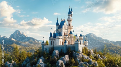 Enchanted fairy tale castle on a hill surrounded by mountains under a bright blue sky with fluffy clouds