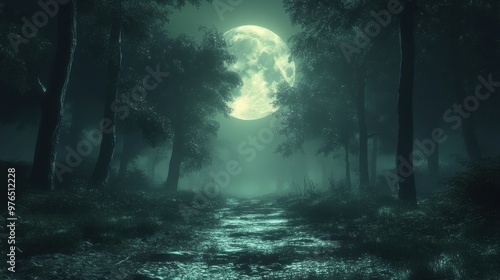 Enchanted Forest Path at Night: Eerie Moonlit Scene with Ghostly Presence and Creeping Shadows