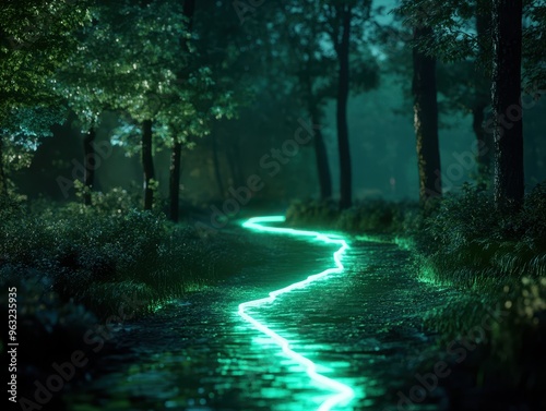 Enchanted Forest Path with Glowing Neon Stream at Night - Mystical Nature Landscape