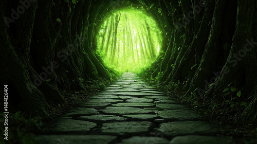 Enchanted Forest Pathway Surrounded by Lush Green Trees and Mystical Light Effect