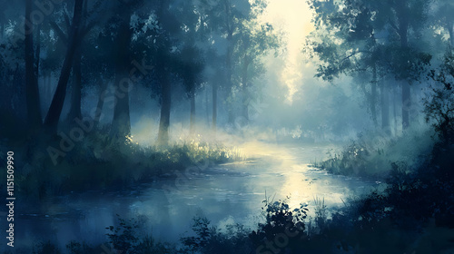 Enchanted Forest River: A Serene Landscape of Misty Woods and Calm Waters
