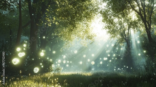Enchanted Forest with Glowing Orbs and Sunbeams