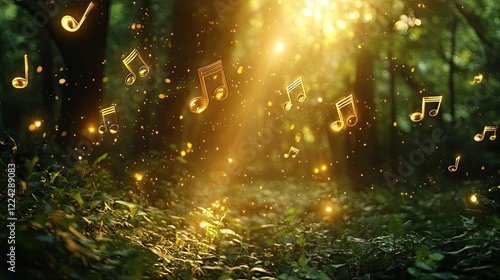 Enchanted Forest with Musical Notes and Sunlight Rays Shining