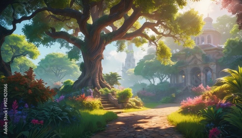 Enchanted Garden Path Leading to a Mysterious Mansion.