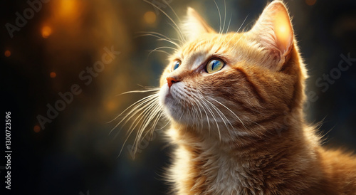 Enchanted Ginger Kitten’s Face in Soft Light, Gazing at Glowing Sparks Against a Dark Background