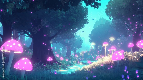 Enchanted Glowing Forest Path: Magical Mushrooms and Fairy Lights