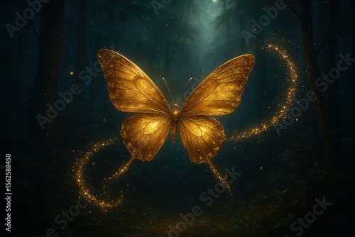 Enchanted golden butterfly surrounded by magical sparkles and fairy dust