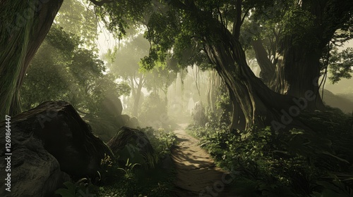 Enchanted Jungle Path: A Misty Forest Trail Through Lush Green Canopy