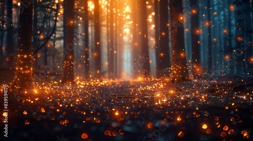 Enchanted Magical Forest Close-Up Double Exposure with Glowing Lights and Copy Space.