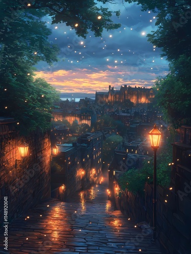 Enchanted Night in the City: A dreamy, digitally painted cityscape glows under a sky awash with twinkling stars. The cobblestone streets are lined with warm lamplight.