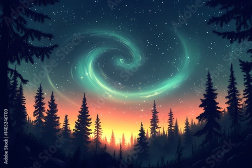 Enchanted Night Sky. Vibrant Galaxy Swirl Over Forest Silhouette - Cosmic Art