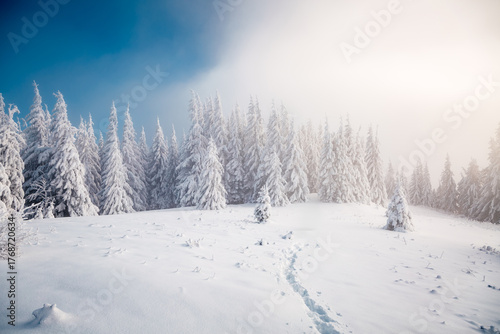 Enchanted snow-covered fir trees glisten in the soft light of a frosty morning. Merry Christmas and Happy new year greeting card.