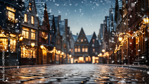 Enchanted snowy evening on a vintage street adorned with holiday lights