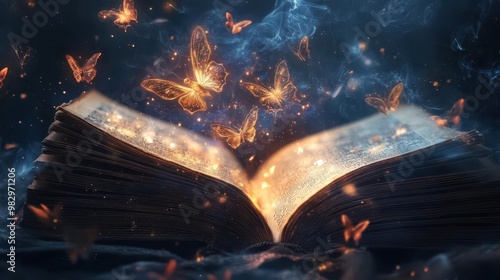 enchanted tome with pages transforming into glowing butterflies emerging from an ornate leatherbound book magical particles swirl in ethereal backdrop