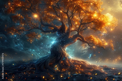 Enchanted Tree with Glowing Leaves in a Mystical Night Landscape