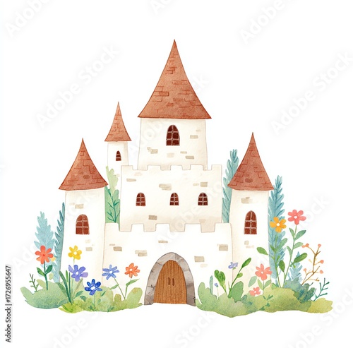 Enchanted Watercolor Castle nestled among lush green trees, a whimsical fairytale scene.