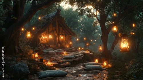 Enchanting cabin nestled in a mystical forest path at dusk, lit by lanterns