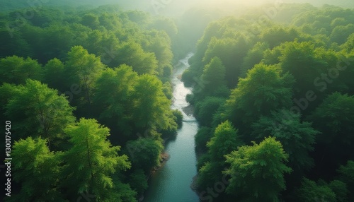 Enchanting dev floating above a serene river surrounded by lush green forests during early morning light