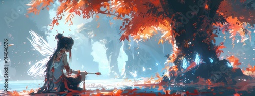 Enchanting fantasy scene with a fairy sitting beneath a glowing tree, surrounded by vibrant red leaves and ethereal light.