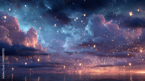Enchanting Fantasy Sky with Floating Lights Over Calm Water