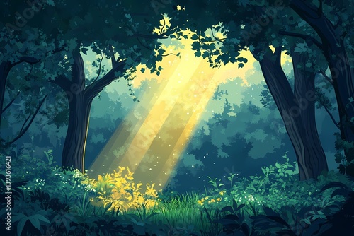 Enchanting Forest Landscape: Sunlight Rays Illuminate Serene Nature Scenery