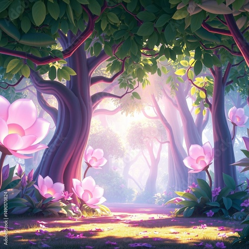 Enchanting forest path with blooming pink flowers and lush green leaves