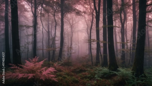 Enchanting forest with pink light and ethereal fog