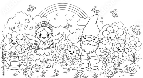 Enchanting Garden Scene Fairy, Gnome, and Blooming Flowers – Coloring Page